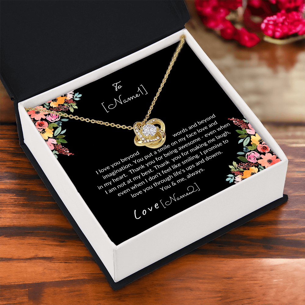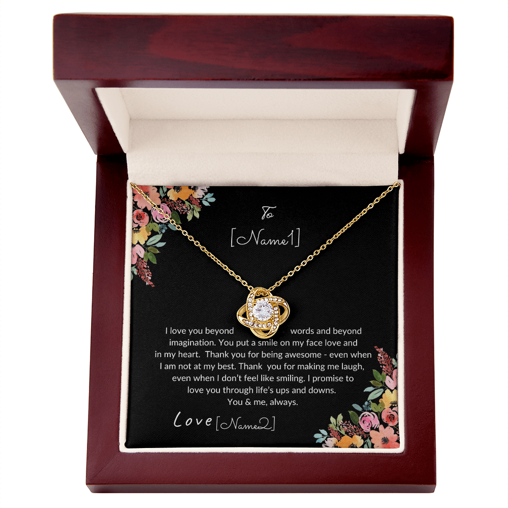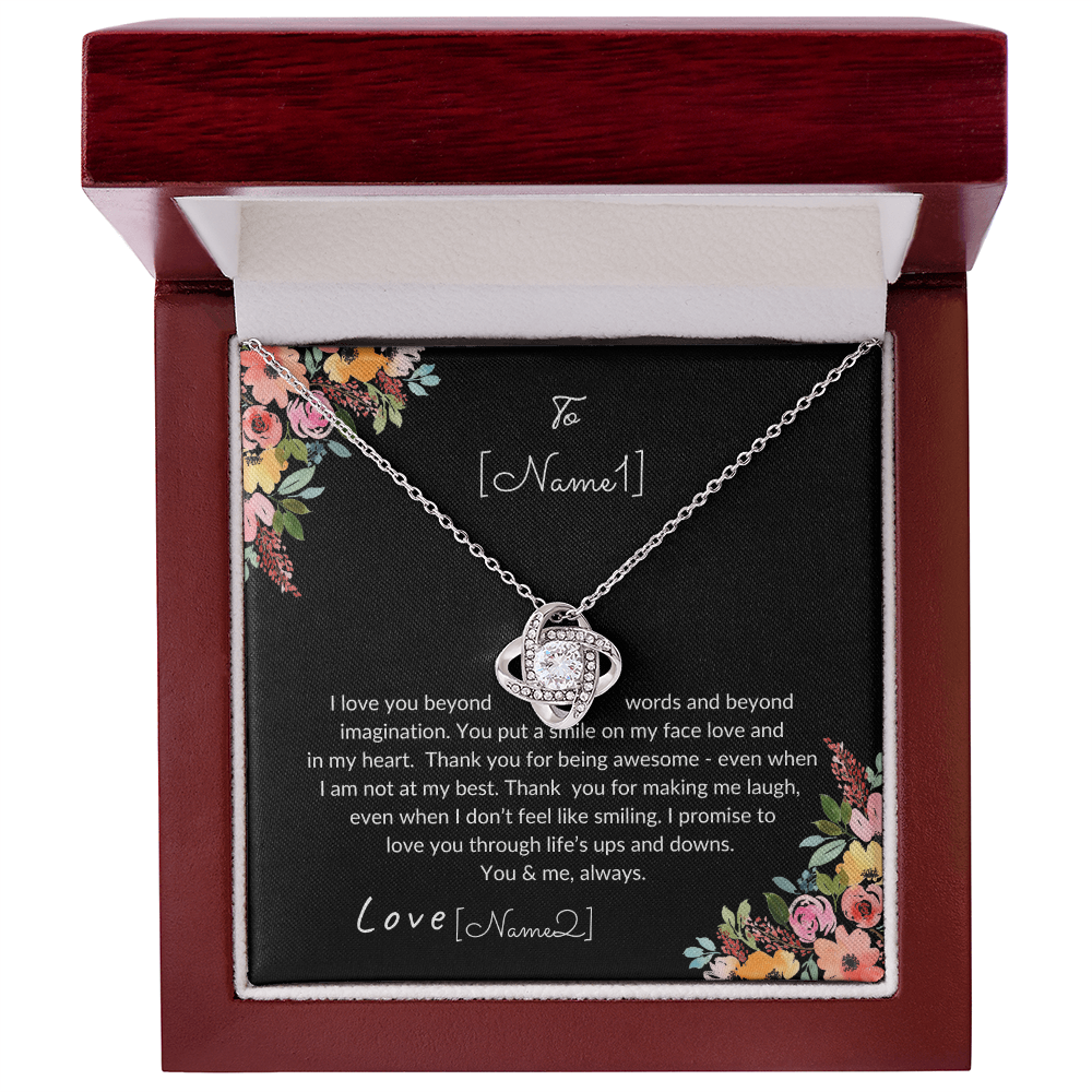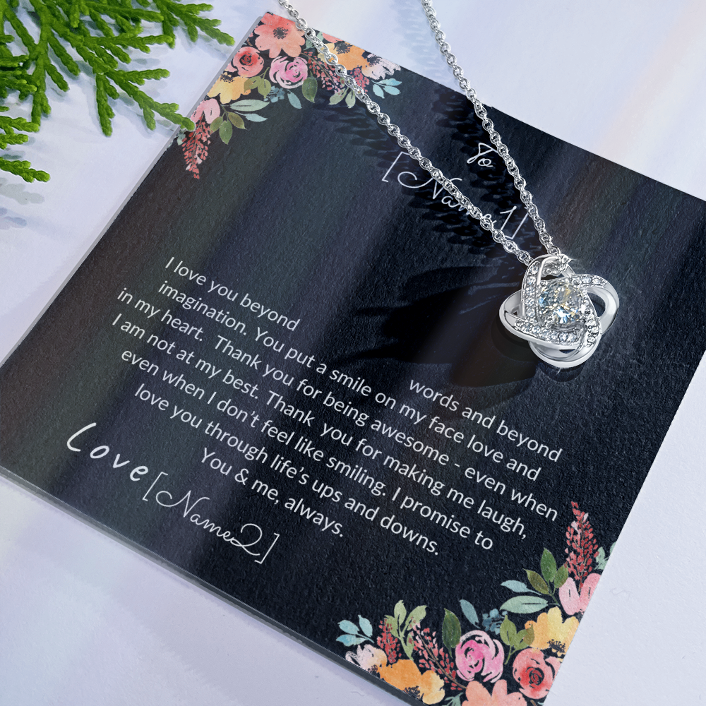 Imagine the joy of receiving this stunning Love Knot Necklace—a timeless symbol of the unbreakable bond between two souls. Featuring a dazzling 6.5mm cubic zirconia crystal surrounded by delicate accent stones, this elegant piece adds a touch of brilliance to any outfit.