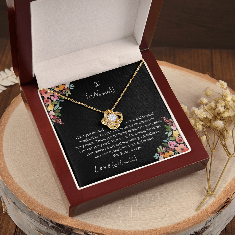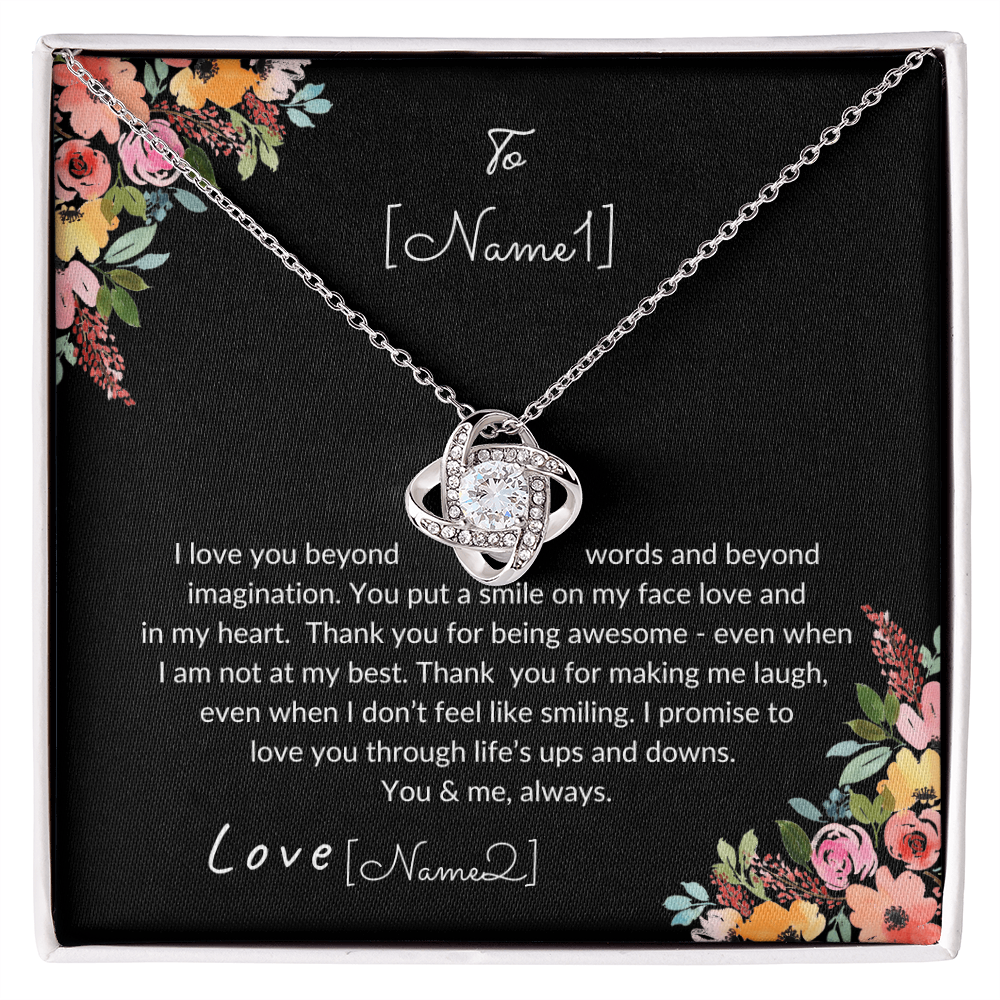 I love you beyond words and beyond imagination. You bring joy to my life and warmth to my heart. Thank you for standing by me, even on the days I fall short. Thank you for making me laugh, even when I don’t feel like smiling. Through life’s ups and downs, I promise to love you always.